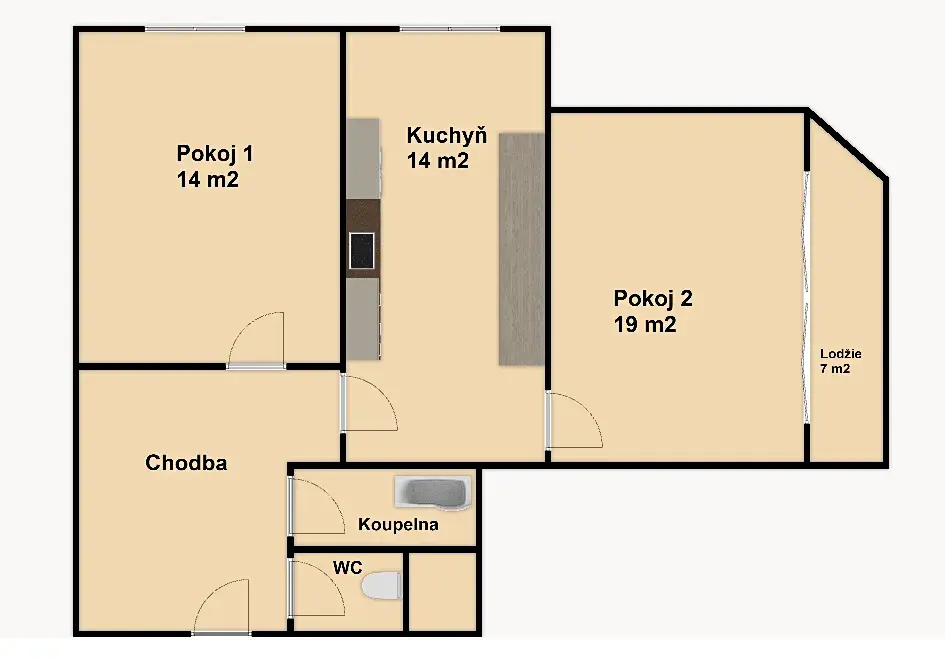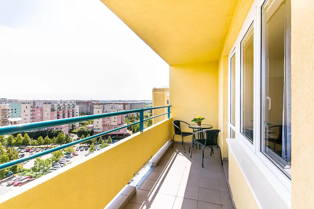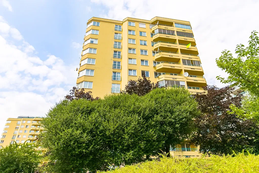 Byt se nachází v 9. patře udržovaného jedenáctipatrového cihlového domu s výtahem. Dispozice nabízí dva neprůchozí pokoje (14 m² a 19 m²) a samostatnou kuchyň s jídelnou (14 m²), která poskytuje dostatek prostoru pro každodenní komfort. Z předsíně je vstup do koupelny a na oddělenou toaletu. Z jednoho z pokojů je přímý vstup na lodžii s volným a klidným výhledem do okolí. Orientace bytu na východ a sever zajišťuje příjemné denní světlo bez přehřívání.