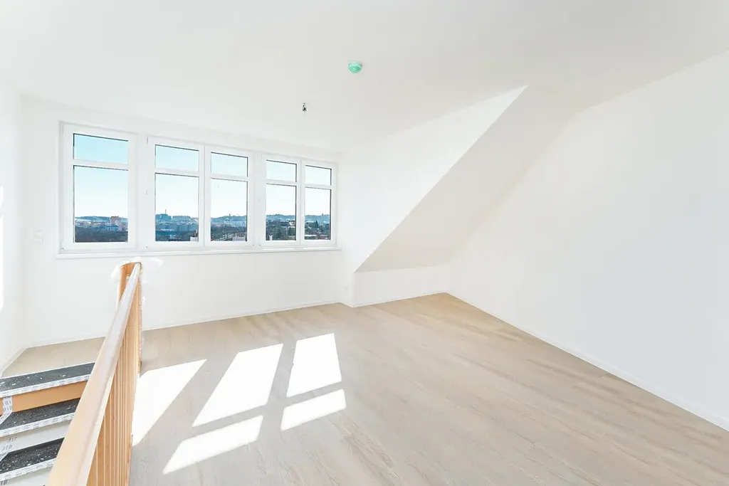 Jednotka je orientována na jihozápad, díky čemuž je interiér po celý den příjemně prosvětlený. Dispozičně je řešena jako mezonet – v dolním podlaží se nachází vstupní hala, samostatná toaleta s koupelnou a prostorná ložnice, v horním patře kuchyňky kout s toaletou a obývací pokoj s přístupem na krásnou terasu.
