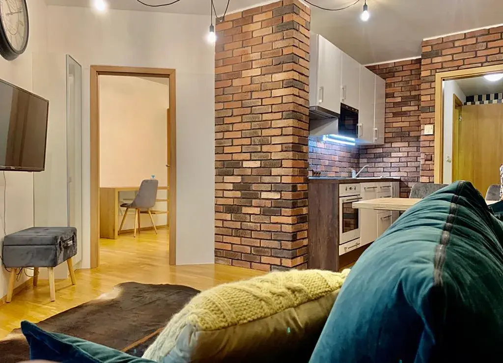 Byt zaujme na první pohled svým moderním interiérem s prvky industriálního stylu, kde se kombinují přírodní materiály, dřevo a designové cihlové obklady. Hlavní obytný prostor plynule propojuje obývací část s kuchyní a jídelním koutem, odkud je přímý vstup na prostornou terasu. Ta nabízí ideální místo pro relaxaci, ranní kávu i večerní posezení.
