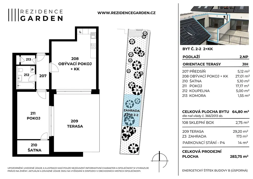 Slepá ulice bez ruchu, stezka u řeky a výhled do zeleně jsou jen začátek. To hlavní se odehrává přímo u vašeho bytu – na velkorysé jižní terase (29 m²) a vlastní zahradě (173 m²).