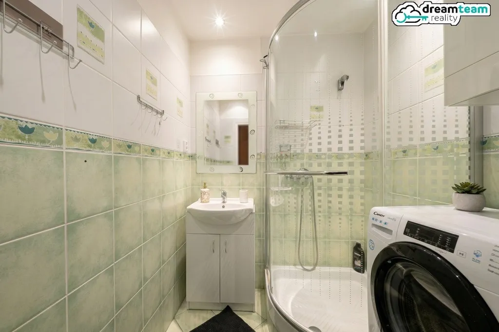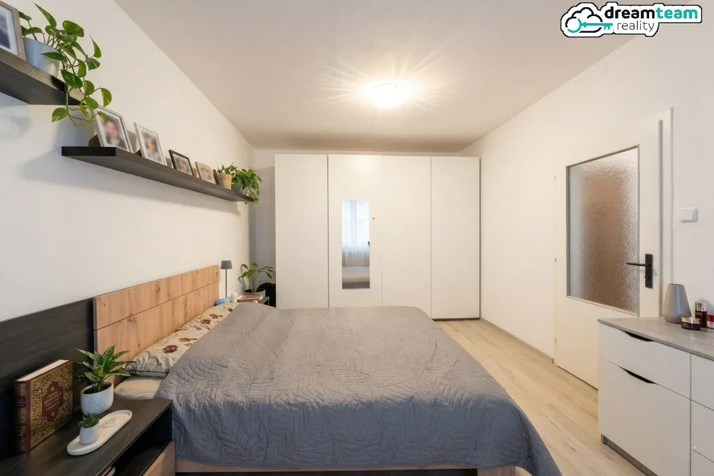 Dva pokoje a jídelna koukají na západ a poslední ložnice na sever — klidný výhled a žádný provoz pod okny. Každý člen rodiny má svůj prostor. Šatna hravě spolkne vysavač, sušák i všechny ty věci, o kterých víte, že je máte, ale nevíte kam s nimi. Koupelna s prostorným sprchovým koutem a místem na pračku je v příjemné světle zelené — takový malý domácí spa. A samostatná toaleta je výhodou vždycky.