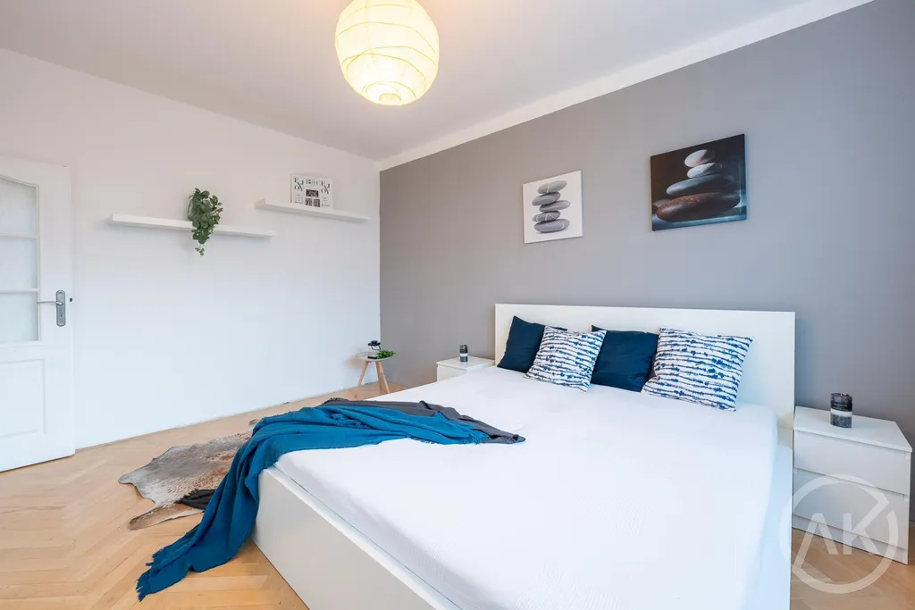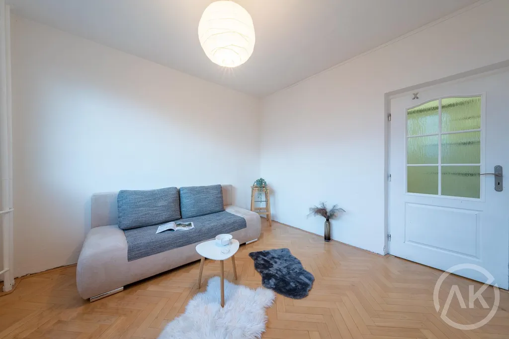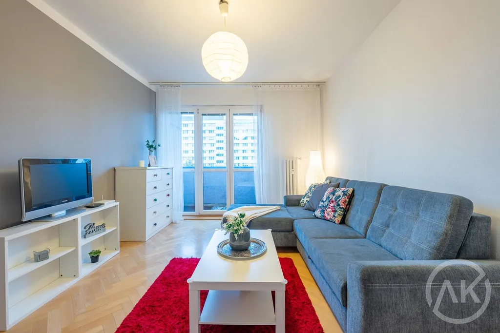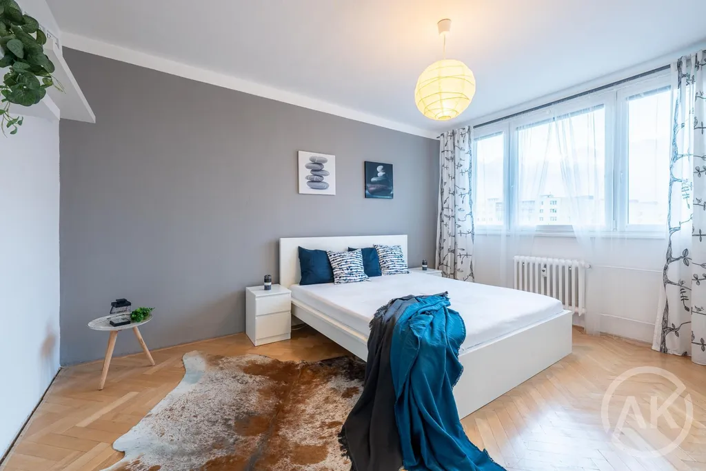Tahle třiplusjednička má tři pokoje, ani jeden z nich není nepoužitelná nudle a taky lodžii, kde se buď v létě vyplácneš nebo tam vyvěsíš v létě prádlo, protože sušáky jsou hnusné.