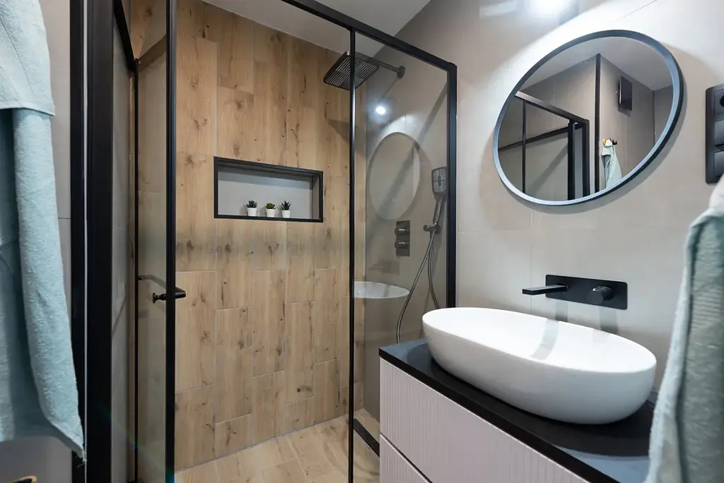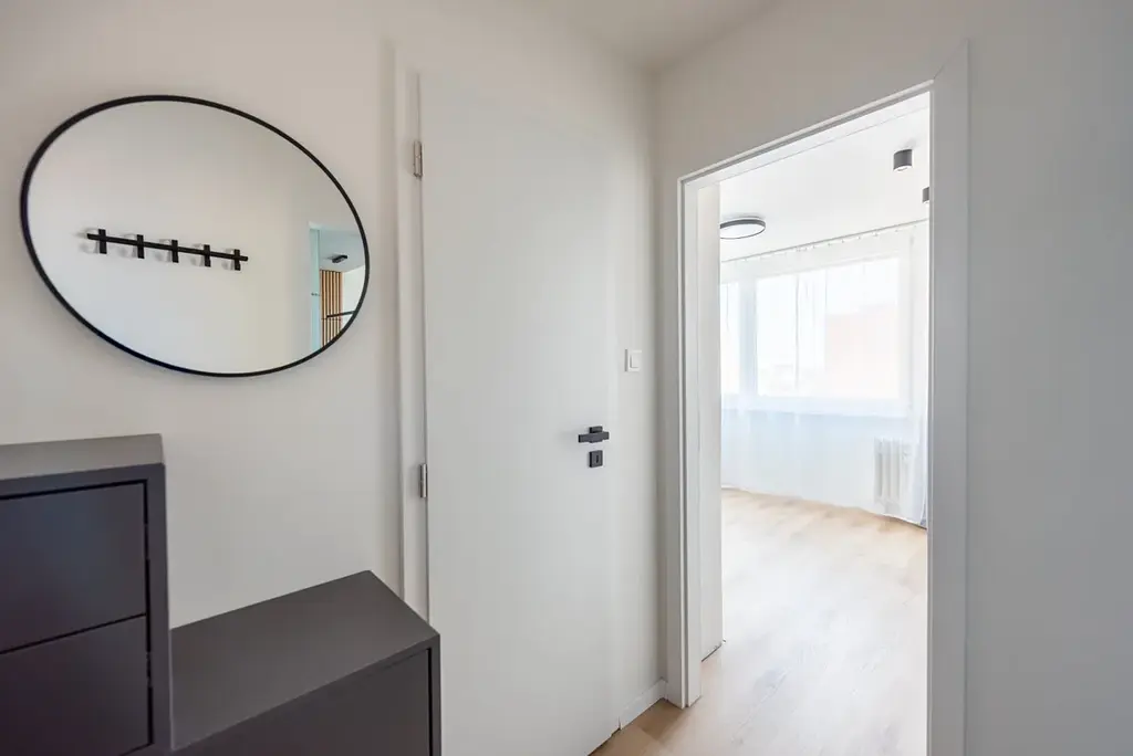 Vnitřní uspořádání - vstupní chodba (2,9m2) s úložnými prostory, samostatná neprůchozí ložnice (10,5m2) s velkou vestavěnou skříní, světlý obývací pokoj (15,6m2) napojený na kuchyňský kout, kde je k dispozici zbrusu nová kuchyňská linka, která poskytuje dostatek pracovní plochy, úložných prostor a je plně vybavena vestavnými spotřebiči (pračka se sušičkou, myčka, lednice s mrazákem, horkovzdušná trouba, mikrovlnná trouba, sklokeramická deska, smart dřez a šikovně zabudovaná digestoř). Moderní koupelna (2,9m2) v nadčasovém designu je vybavena dostatečně prostorným sprchovým koutem a wc.