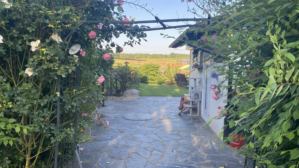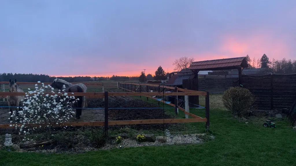 Domek je plně vybavený, pro celoroční provoz - vlastní kuchyň, myčka, lednice, topení, voda, TV, s roletami a přímým výhledem na koně. Tento domek se dá pronajímat k bydlení.