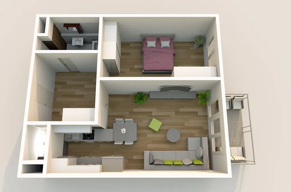 Bytová jednotka sestává z obývacího pokoje s kuchyňských koutem 25,2 m2, ložnice 15,3 m2, vstupní chodby 10,3 m2, koupelny 5,6 m2 a WC 1,8 m2.