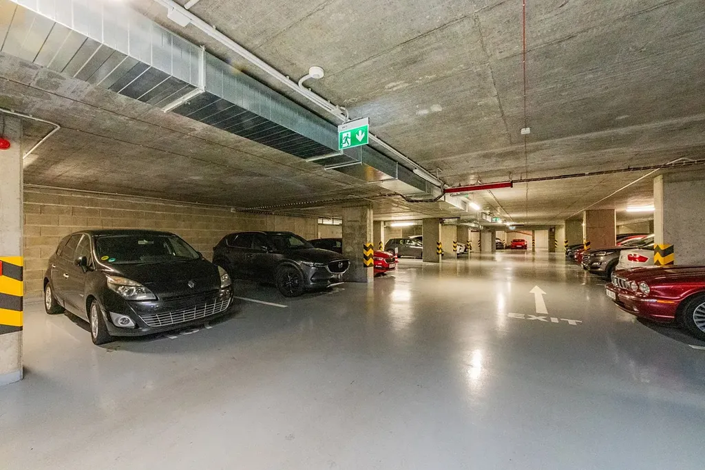 K bytu náleží prostorná sklepní kóje 4 m2 a nadstandardní, rozšířené garážové stání (18 m2, vejde se auto s motorkou) v druhém podzemním podlaží téže budovy.