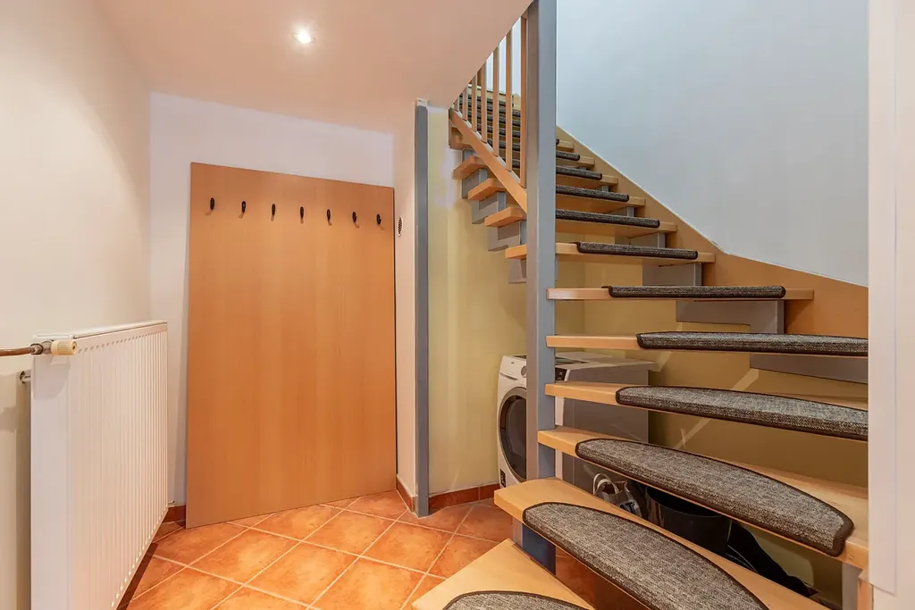 Vytápění zajišťuje plynový kotel. Díky původnímu širokému zdivu dům dobře funguje i z hlediska tepelného komfortu — v zimě drží teplo, v létě je uvnitř příjemné klima.