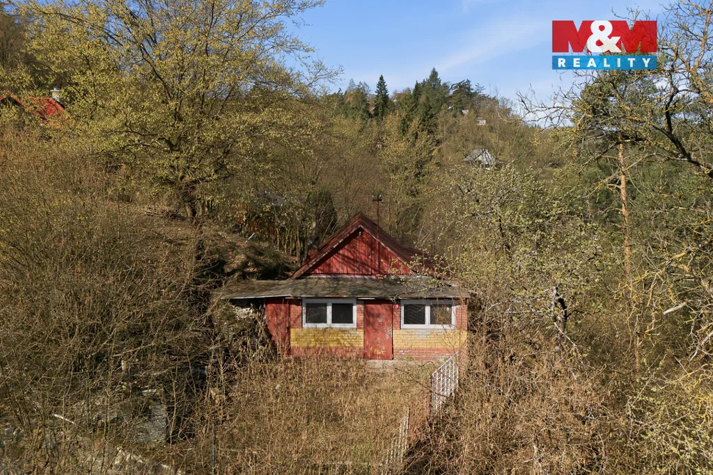 Pozemek je svažitý, ale právě to je jeho největší výhoda – nabízí krásné výhledy do krajiny a na řeku Berounku, která je jen kousek od chaty.