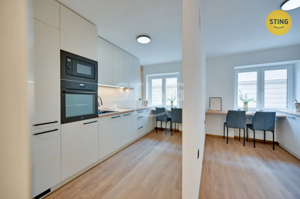 Při modernizaci, která byla dokončena v dubnu 2026, byl kladen důraz na kvalitní materiály i současné trendy v oblasti bydlení. Součástí jsou nová plastová okna, elegantní vinylové podlahy a moderní kuchyňská linka vybavená vestavěnými spotřebiči – indukční varnou deskou, troubou, myčkou na nádobí, digestoří a lednicí s mrazákem. Interiér působí čistě, svěže a je připraven k okamžitému nastěhování bez nutnosti dalších investic.