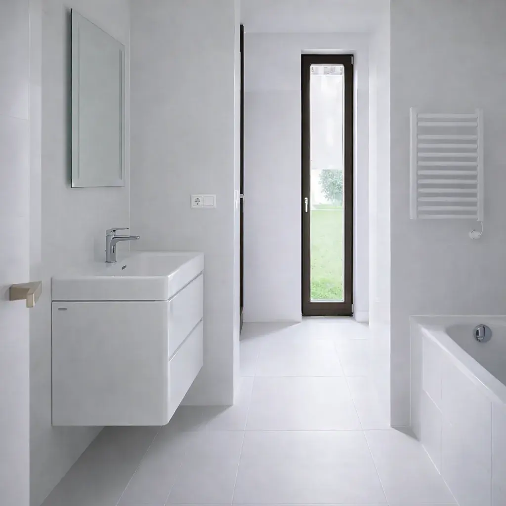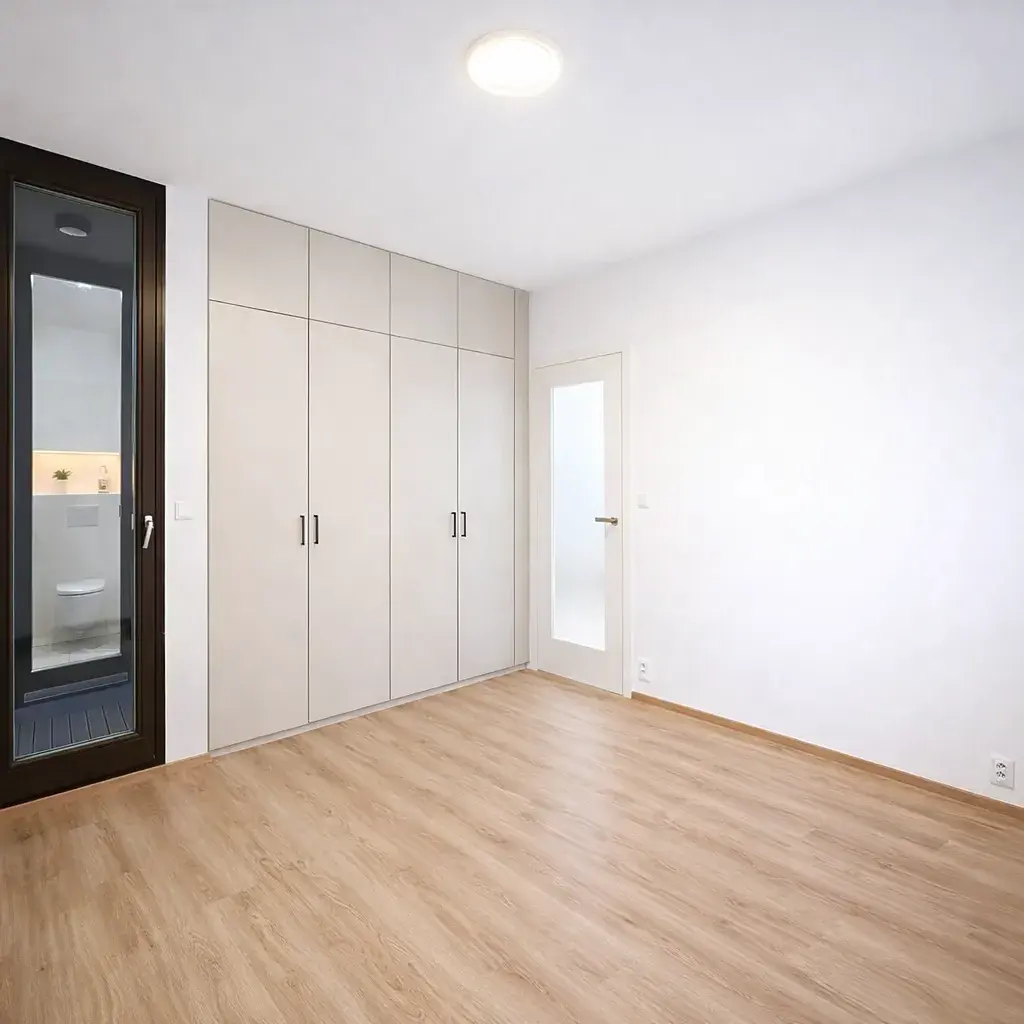 Použity byly vysoce kvalitní materiály – moderní vinylové podlahy v kombinaci s velkoformátovou dlažbou, které podtrhují elegantní a čistý charakter celého bytu.
