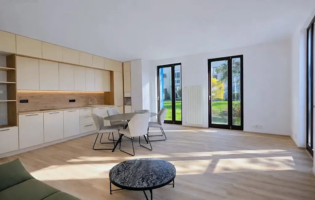 Byt byl navržen s důrazem na maximální komfort, funkčnost a nadčasový design. Dominantou interiéru je designová kuchyňská linka na míru s kompletně vestavěnými spotřebiči (indukční varná deska, horkovzdušná trouba, mikrovlnná trouba, myčka nádobí, lednice s mrazákem), která uspokojí i nejnáročnější klientelu.