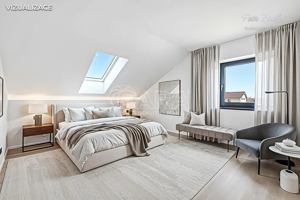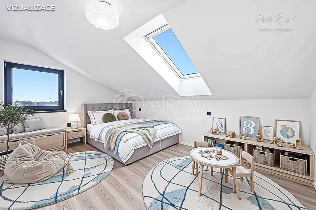 V patře na vás čeká klidová zóna, která nabídne ložnici, dva samostatné pokoje, šatnu a druhou koupelnu. Každý člen rodiny zde najde dostatek soukromí, pohodlí i vlastního prostoru.