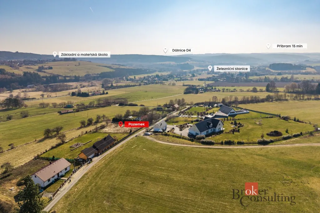 Pozemek se nachází v klidné části obce s příjemnou atmosférou venkova, obklopený přírodou a zároveň s dobrou dostupností do Příbrami i směrem na Prahu. Lokalita je vhodná pro ty, kteří hledají kombinaci soukromí, prostoru a dostupnosti služeb.