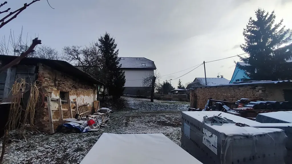 Na pozemku jsou označeny čtyři garáže, ale fyzicky zde stojí pouze torzo jedné poslední.