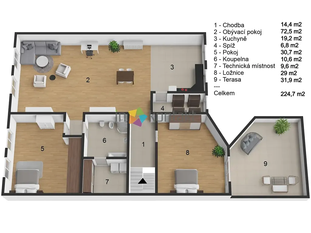 Celková podlahová plocha včetně terasy: 224,7 m².