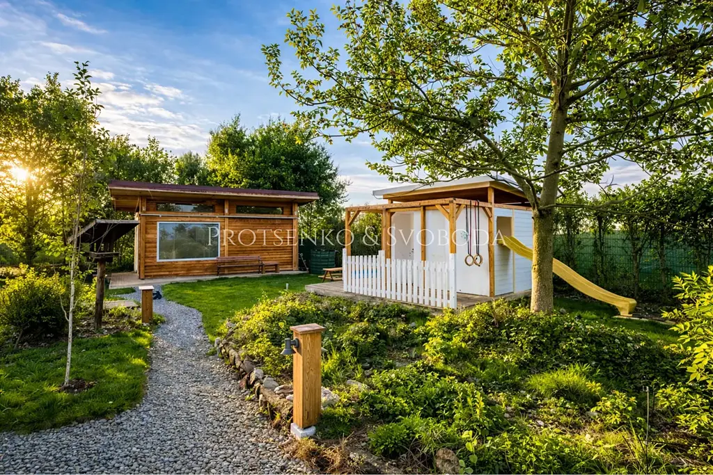 Najdete zde zahradní domek, ohniště, vyvýšené záhony, zahradní sprchu, živé ploty i množství ovocných a okrasných dřevin, které potěší oko i chuť. Štěrkové chodníčky propojují jednotlivá zákoutí a dávají celé zahradě jedinečný řád, eleganci a téměř romantickou atmosféru. Je to místo, kde si děti mohou hrát, dospělí odpočívat, tvořit, pěstovat, snít — a kde každý den přináší nový důvod zůstat o chvíli déle venku.
