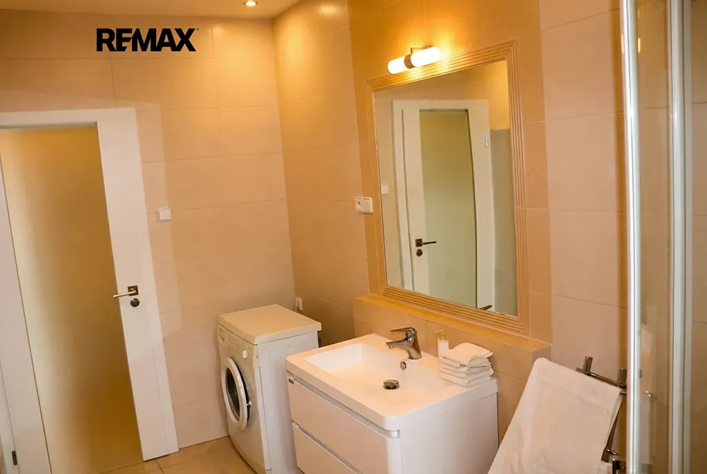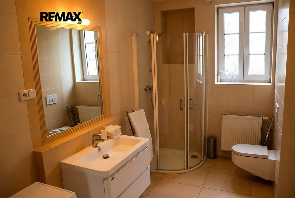 • Koupelna pro ranní rituály: Moderní sprchový kout, čistý design a vše potřebné včetně pračky.