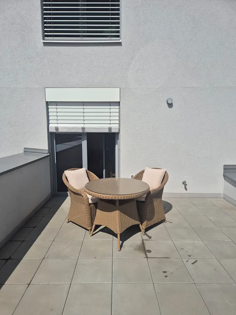 Terasa: Z obývacího pokoje je vstup na prostornou terasu s ratanovým nábytkem, která nabízí skvělý prostor pro relaxaci.