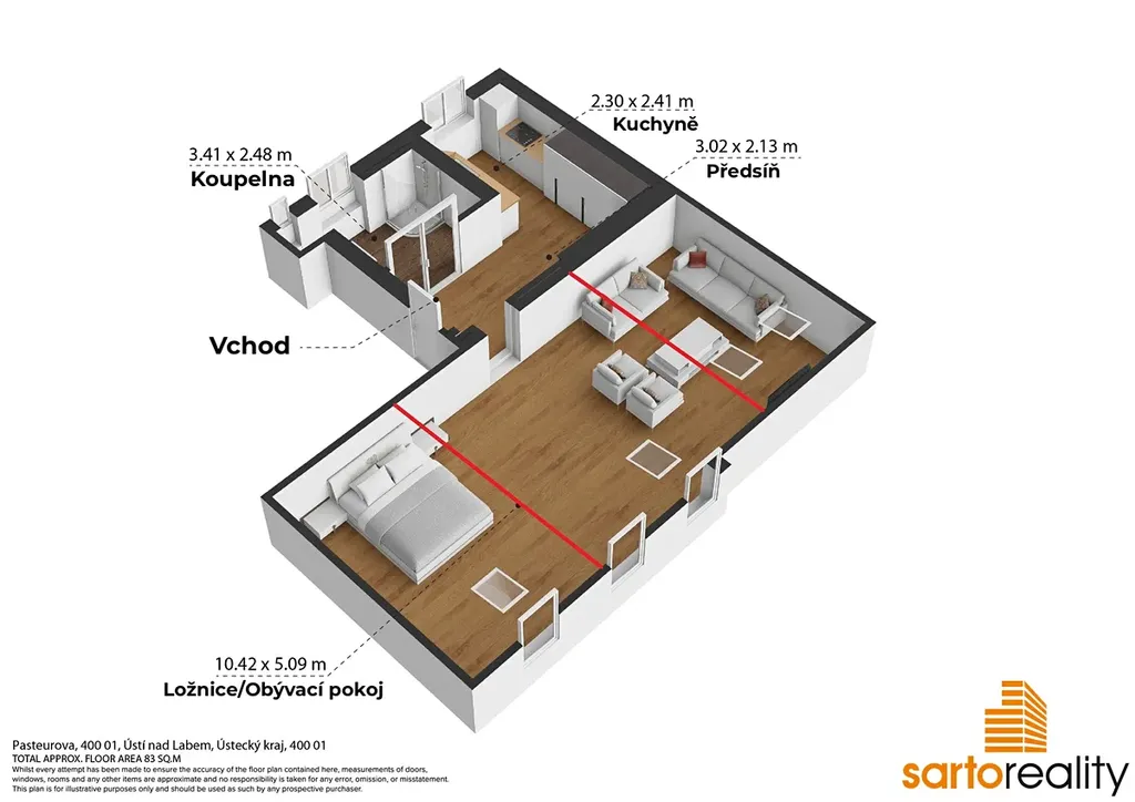 Byt, o velikosti 76,5 m2 (dle prohlášení vlastníka s dispozicí 3+1), je situovaný do 4.patra (5.NP) bytového domu. Při nákladné rekonstrukci, která proběhla před několika lety, byl kladen důraz hlavně na prostor a tak je hlavní obytná sekce otevřená. Nicméně není problém lehkými příčkami rozdělit současné uspořádání na praktičtější dispozici. V tu chvíli dostane nový vlastník velký byt za atraktivní cenu, kterou v této lokalitě jen tak neseženete.