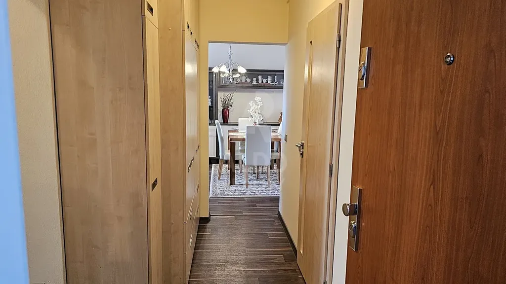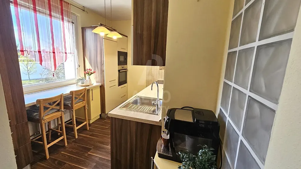 Interiér je ve velmi dobrém stavu, bez dalších nutných investic. Součástí je kuchyňská linka včetně spotřebičů, koupelna s rohovou vanou, vestavná skříň v předsíni, v ložnici a nové podlahy vinylové podlahy v celém bytě. Interiér působí elegantně a nadčasově. K bytu náleží dvě sklepní kóje, jedna na patře, druhá v přízemí domu.
