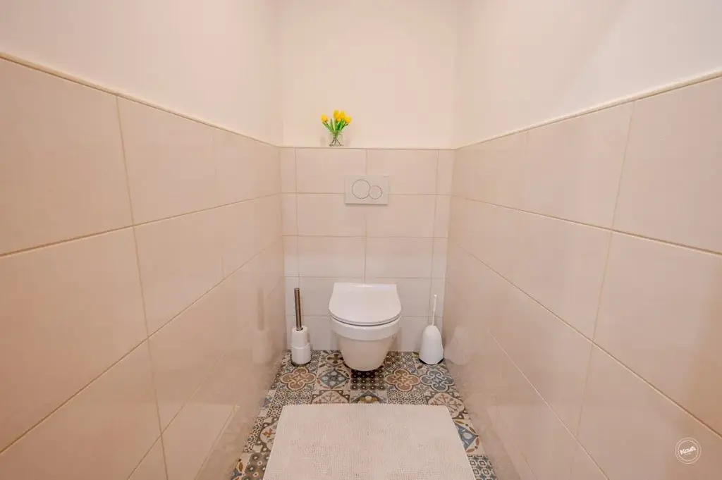 Koupelna je vybavena vanou a přípojkou na pračku. Toaleta je oddělena. V bytě jsou nové rozvody (měď/plast) a plastová okna s dvojskly. Ohřev vody zajišťuje vlastní bojler, vytápění je řešeno centrálně z domovní kotelny s plynovým kotlem.