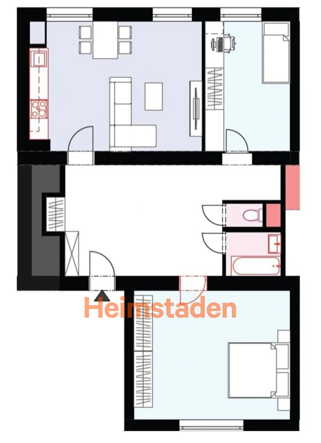 Interiér bytu nabízí tři samostatné a neprůchozí pokoje, což zajišťuje dostatek soukromí – ideální řešení jak pro sdílené bydlení, tak pro rodinu. V předsíni, kuchyni i pokojích jsou položeny plovoucí podlahy v moderním šedém dekoru, které dodávají bytu jednotný a čistý vzhled.