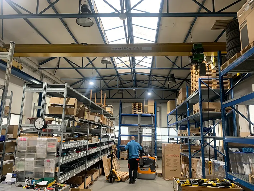 - Ve výrobní hale se nachází celkem 2x Mostový jeřáb nosnost 3200Kg a 2x sloupový otočný jeřáb nosnost 250Kg.