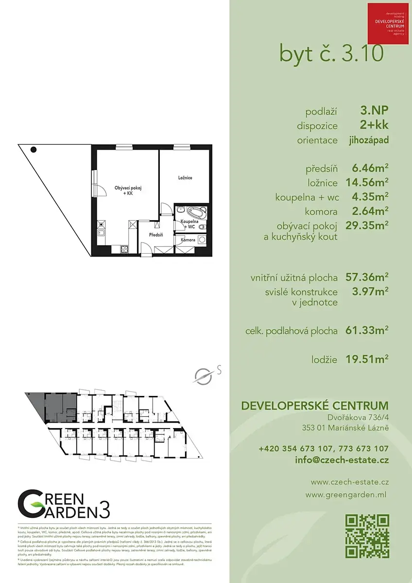Nabízíme Vám možnost koupě bytů ve 3.etapě úspěšného projektu Green Garden v Mariánských Lázních. Projekt Green Garden 3 je vyprojektován jako maximálně úsporný objekt, a to z hlediska zateplení (PENB, třída B), tak i systému vytápění, který bude tvořen energetickým mixem díky plynovým kotlům a tepelným čerpadlům. V nabídce jsou byty dispozice 1+kk, 2+kk a 3+kk, a nově i přízemní byty s prostornými předzahrádkami. Po dohodě lze pro budoucí majitelé připravit byty dle vlastní dispozice a požadavků. Dále si budoucí majitelé mohou zakoupit sklepní kóji nebo parkovací stání v areálu. Projekt Green Garden 3 se nachází ve velmi klidné lokalitě centra města na hranici lesa a blízko nákupně-administrativní zóny Nová Chebská. Dle obvyklého standardu developera jsou byty vybaveny kvalitními zařizovacími předměty (podlahy, dveře, koupelny), celý budoucí areál bude oplocen, hlídán kamerovým systémem a součástí areálu bude samozřejmě i dětské hřiště, vše v těsném sousedstvím s parkem a lesem. Kolaudace je naplánovaná nejpozději do konce 1. kvartálu 2027. Kompletní nabídka volných bytů včetně ceníku a podrobných informací je k dispozici na naších webových stránkách.