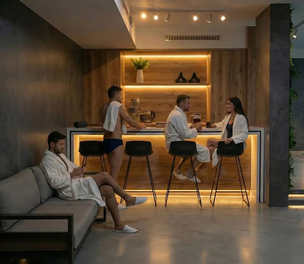 - hlavní prostor s bazénem, posezením, lehátky a kuchyňským koutem s barovou zónou,