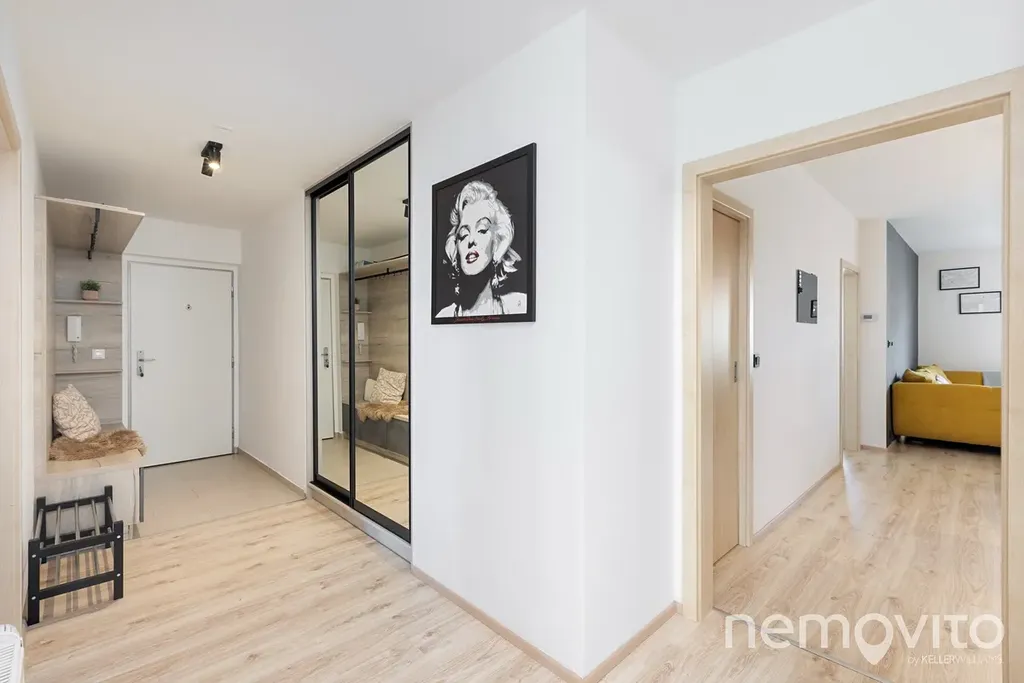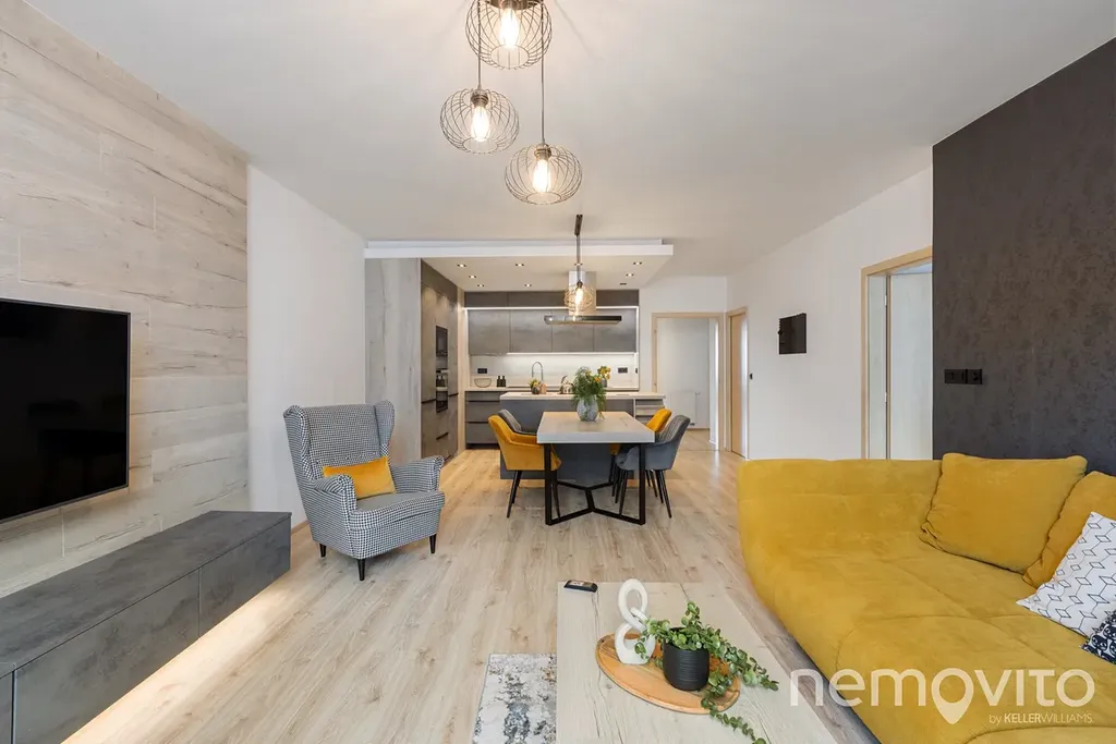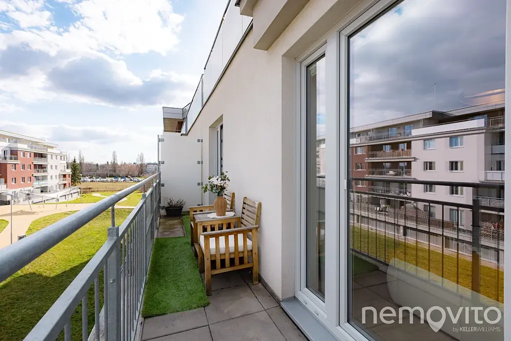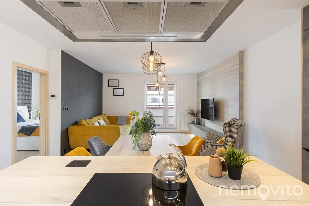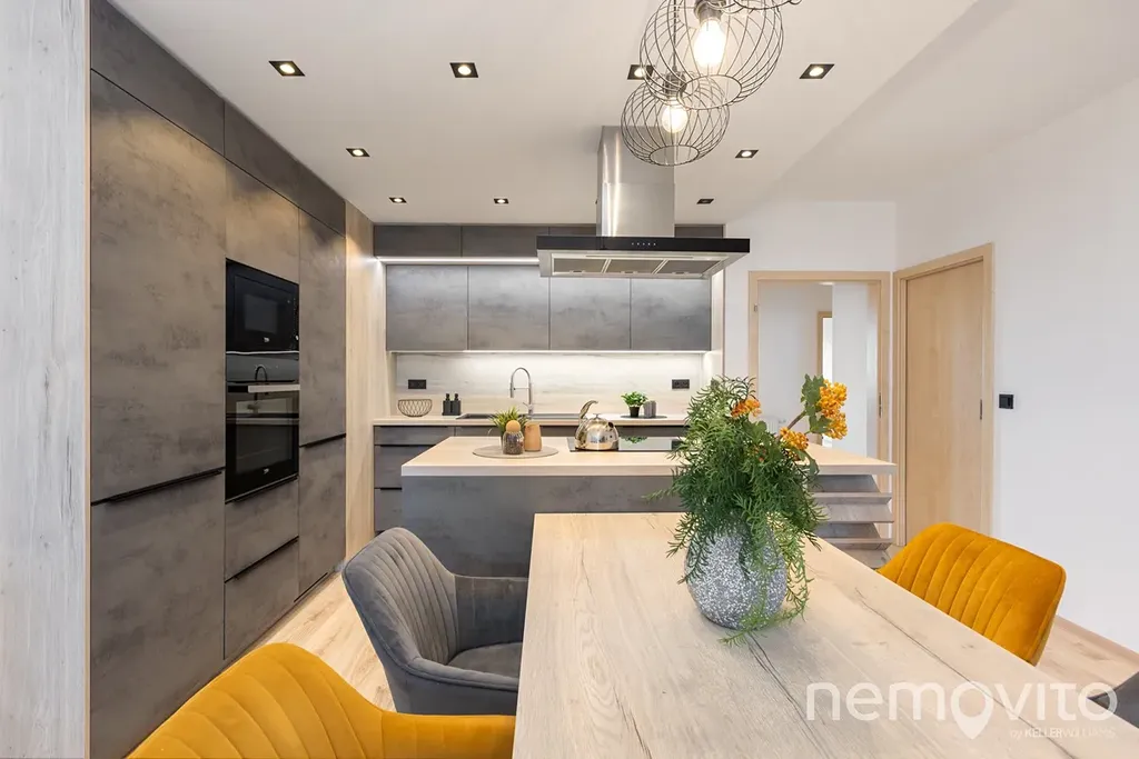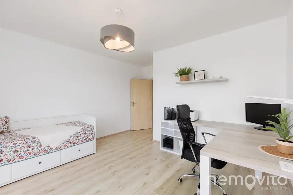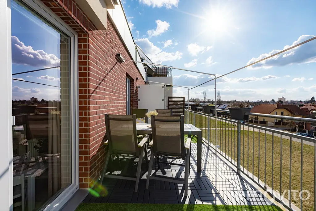 Je umístěn ve třetím podlaží budovy z roku 2019 a je v perfektním stavu bez nutných investic. Veškerý nábytek v obýváku a vestavěné prvky jsou řešeny na zakázku, přičemž kuchyňská linka je skutečná rozměrná a obsahuje velkou spoustu úložných prostor, kterým však asistuje ještě rozměrná komora (5 m2). Z každé místnosti bytu je výstup na terasu - ta u obýváku je užší, vzadu u ložnic je plocha celých 19 m2 a orientace na severozápad.