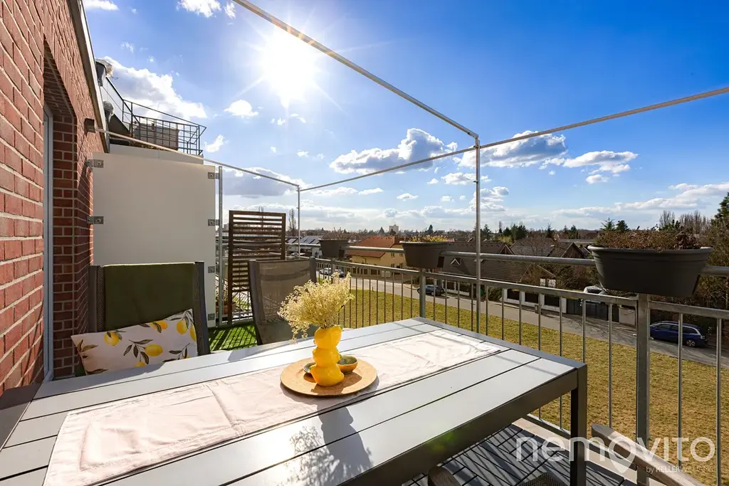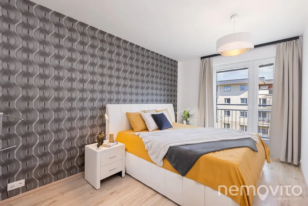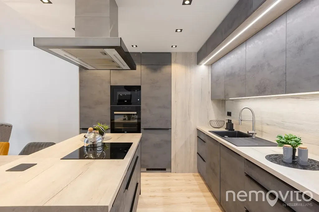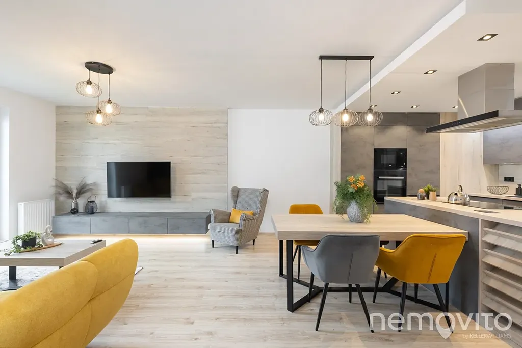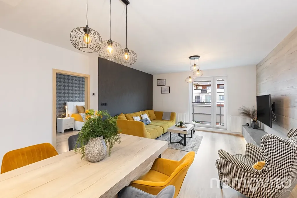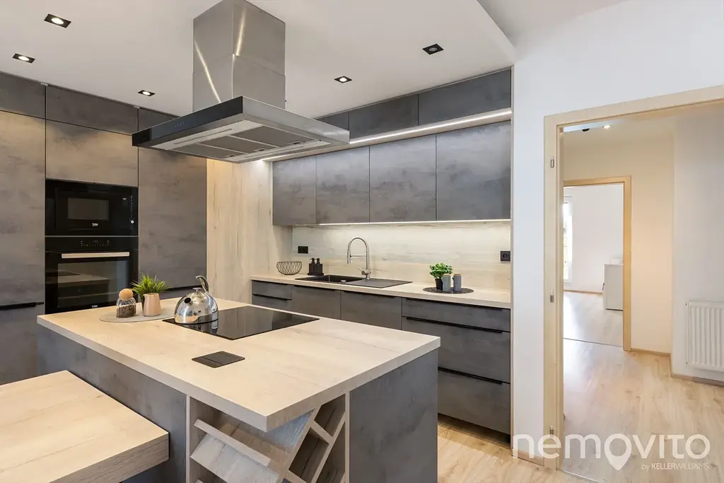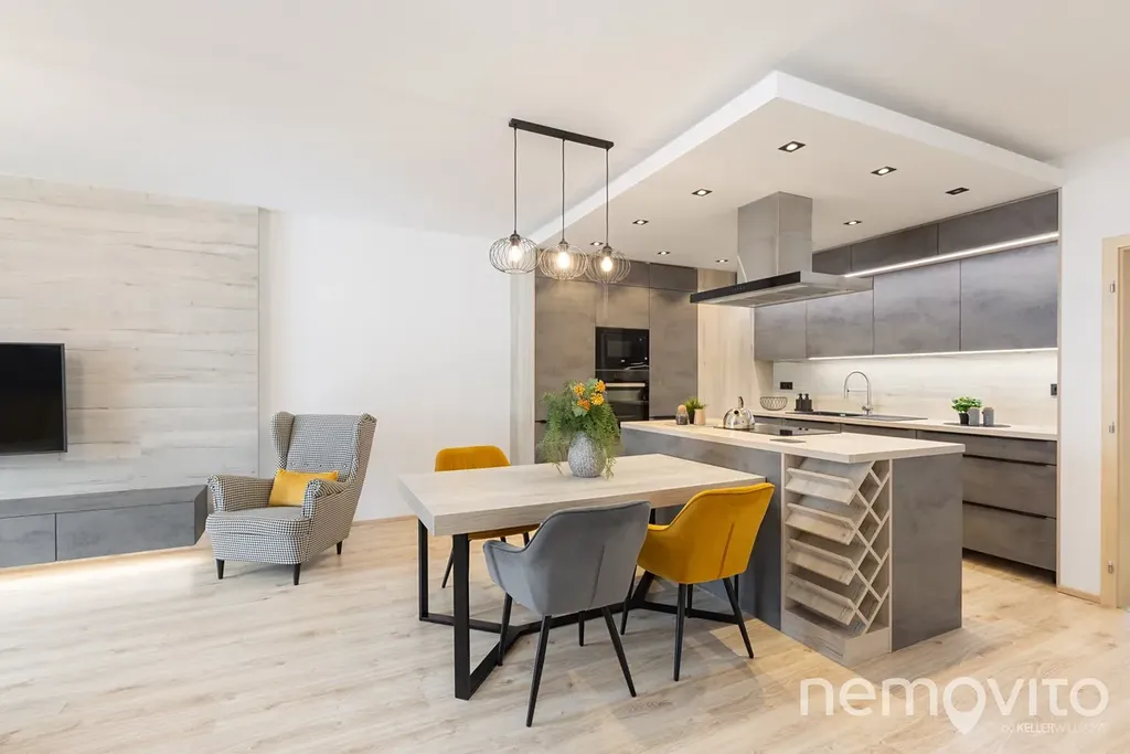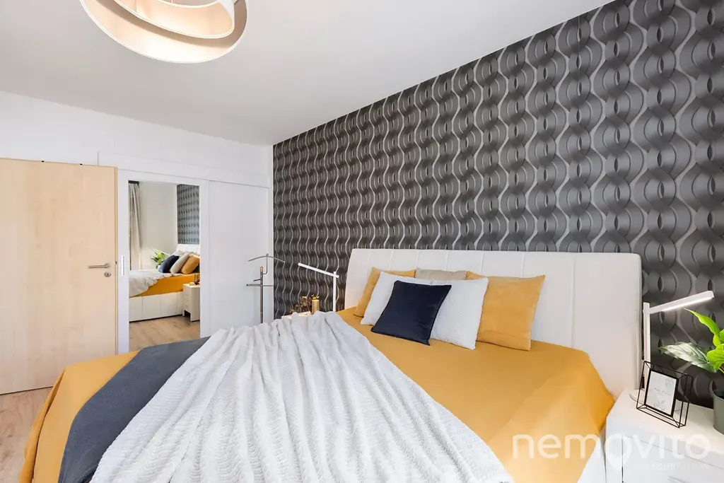 Je umístěn ve třetím podlaží budovy z roku 2019 a je v perfektním stavu bez nutných investic. Veškerý nábytek v obýváku a vestavěné prvky jsou řešeny na zakázku, přičemž kuchyňská linka je skutečná rozměrná a obsahuje velkou spoustu úložných prostor, kterým však asistuje ještě rozměrná komora (5 m2). Z každé místnosti bytu je výstup na terasu - ta u obýváku je užší, vzadu u ložnic je plocha celých 19 m2 a orientace na severozápad.