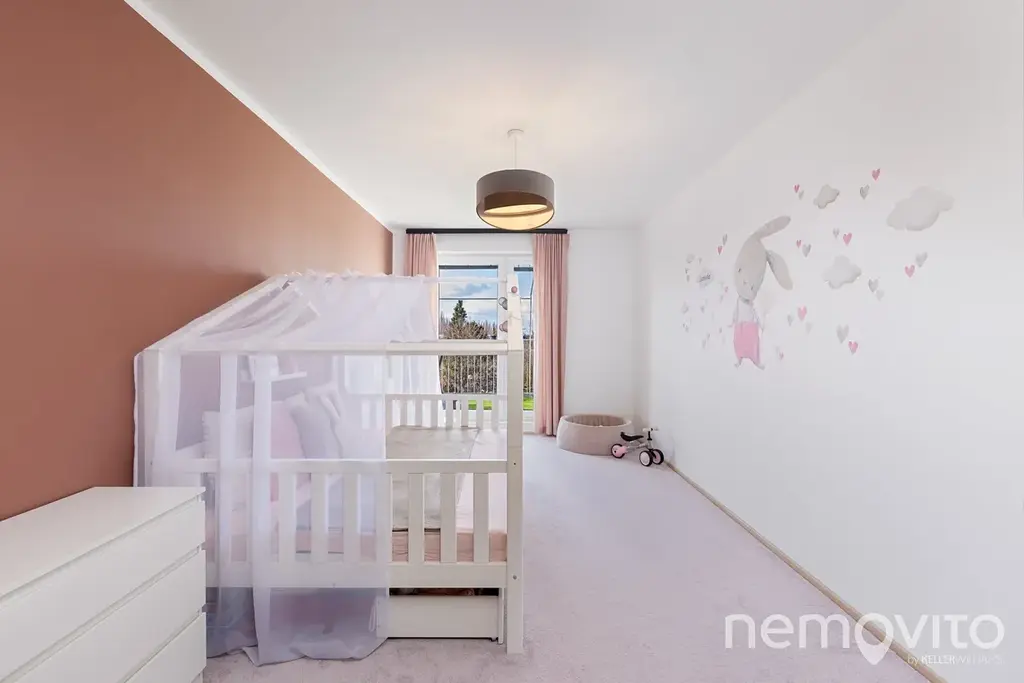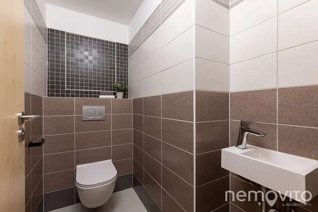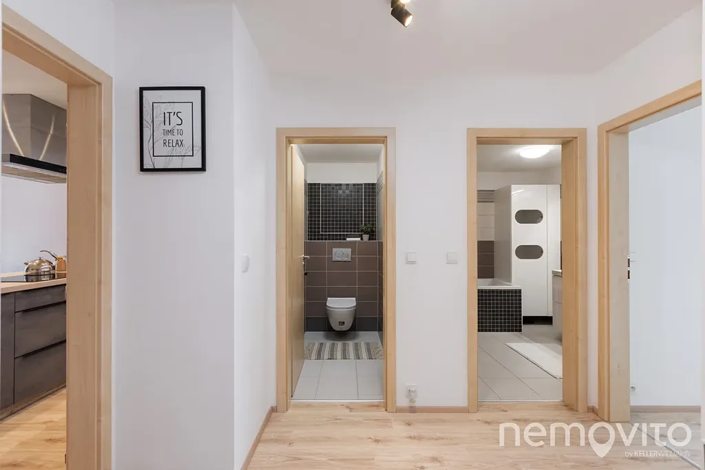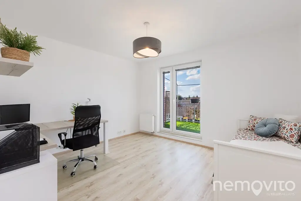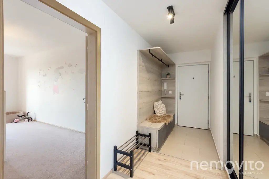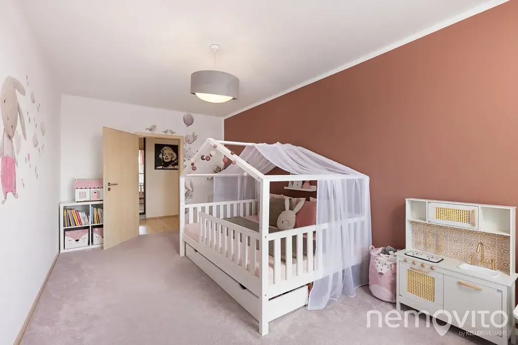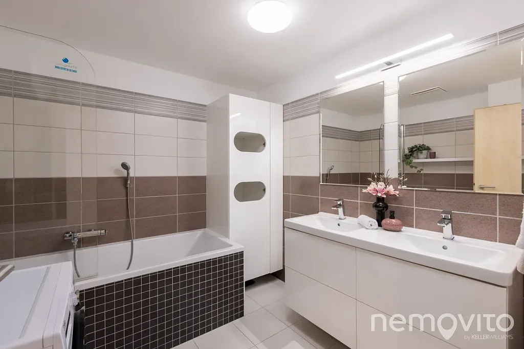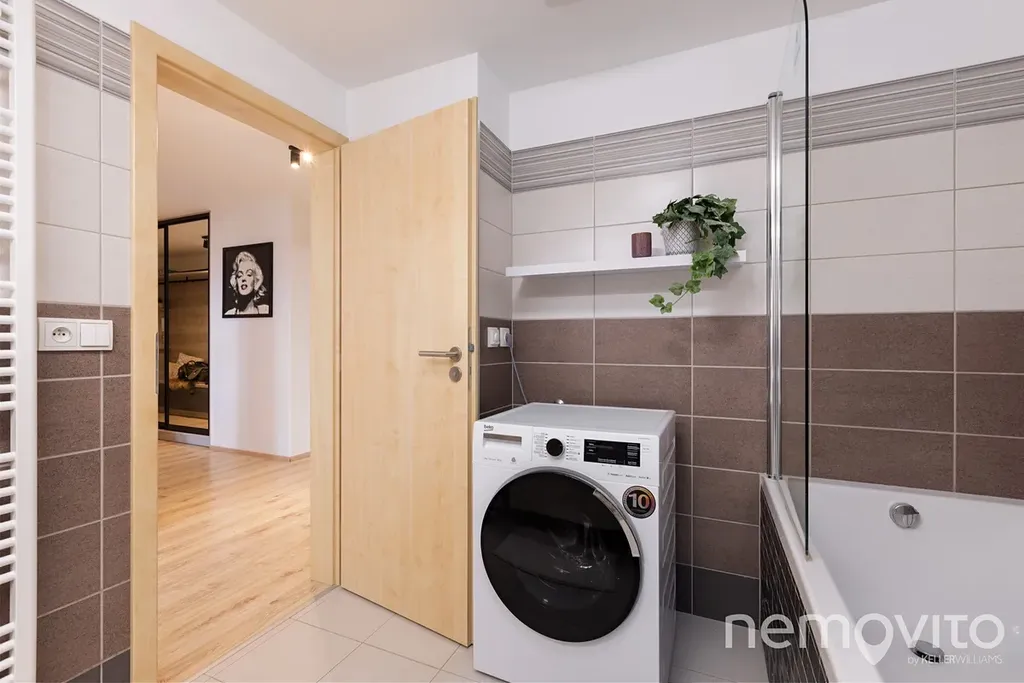 WC je oddělené od koupelny, ve které je vana a místo na pračku a sušičku. Prostorná chodba nabízí ještě prostor pro vestavěnou šatní skříň u vstupu. Hlavní ložnice má k dispozici vlastní šatnu, dětské pokoje o ploše 17 m2 jsou na druhé straně bytu. K bytu náleží ještě ocelová sklepní kóje (5 m2) a garážové stání v suterénu domu. V něm nechybí také prostor na kola a kočárky. Přístup je bezbariérový.