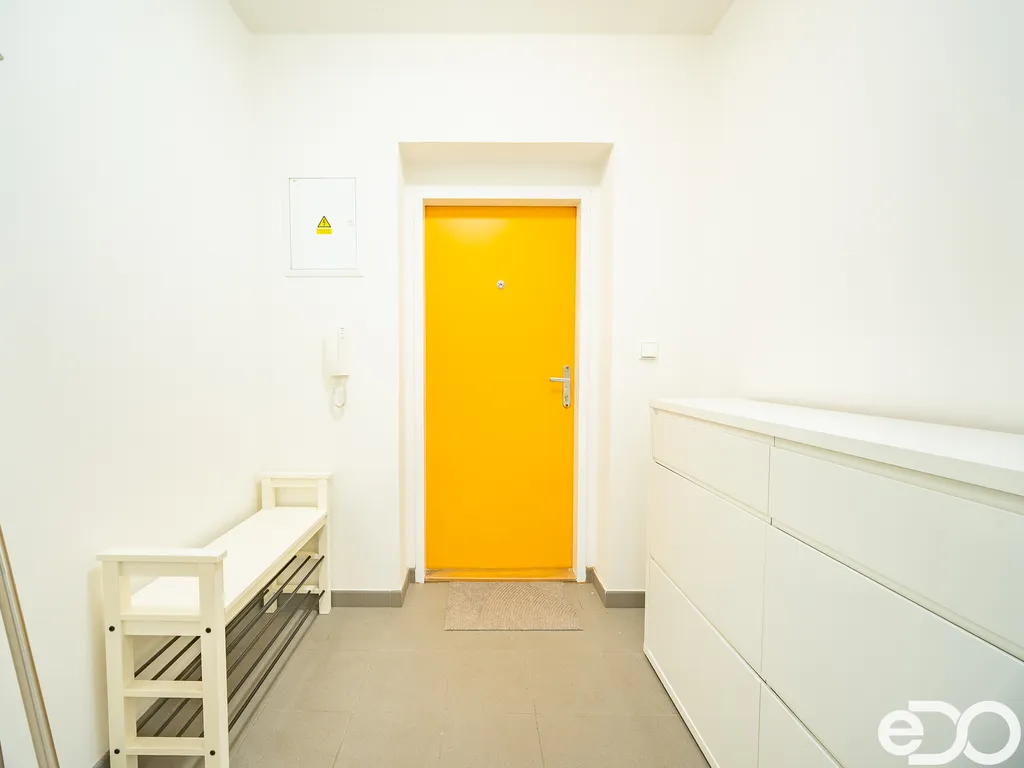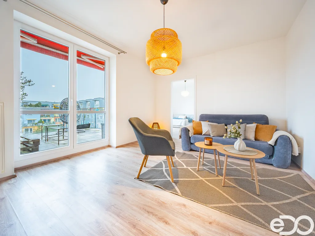Obývací pokoj i ložnice jsou propojené, zároveň však mají každý vlastní vstup, takže dispozice umožňuje jejich samostatné využití. Z obou těchto místností je přímý vstup na terasu. Byt je přístupný z pavlače s příjemným výhledem na dominantu města – Valdickou bránu.