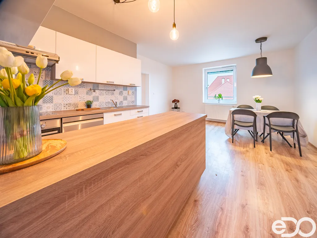 Plocha bytu činí téměř 90 m² (bez sklepu a terasy), což je v této kategorii opravdu výjimečné. Dominantou je velkorysá kuchyně o velikosti cca 25 m², která nabízí dostatek prostoru nejen pro vaření, ale i pro každodenní rodinný život. Na byt navazuje prostorná terasa o výměře cca 17,5 m² se západní orientací, ideální pro odpočinek i večerní posezení.