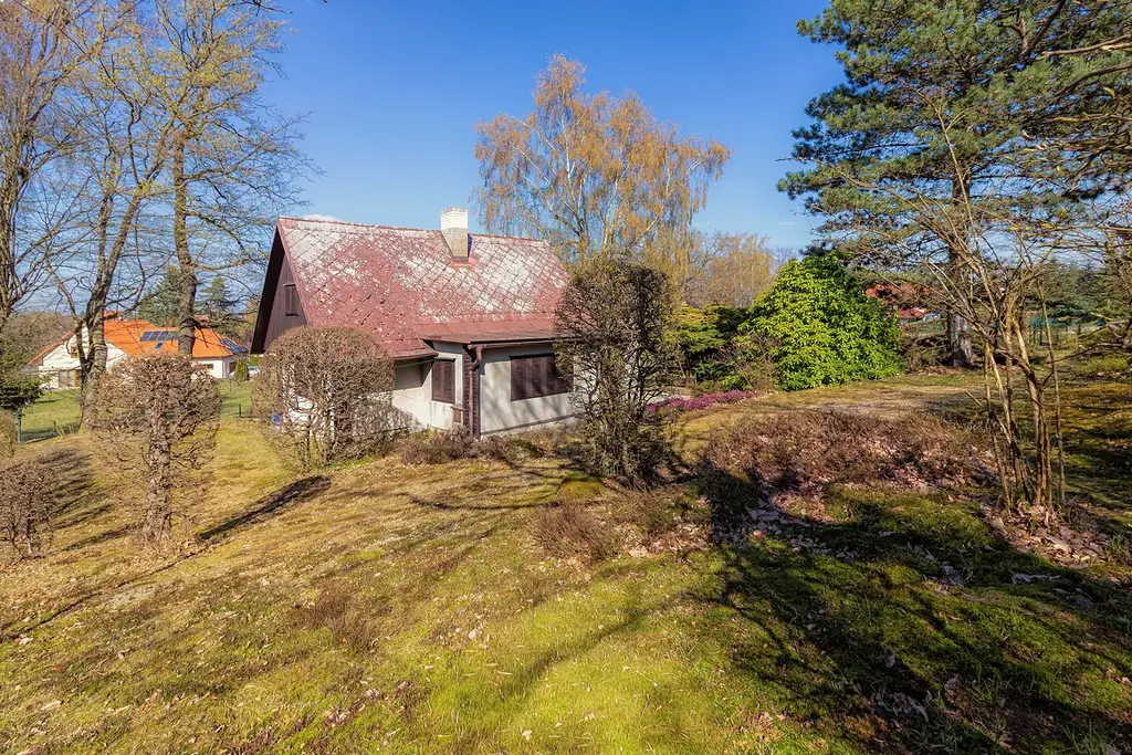 Samotný pozemek působí velmi příjemným dojmem. Je osazený vzrostlými stromy a okrasnou zelení, nabízí příjemné soukromí a díky mírně svažitému terénu má i přirozeně otevřenější charakter. Součástí chaty je také prostorná terasa, orientovaná do zeleně, která podtrhuje příjemný charakter celého místa.