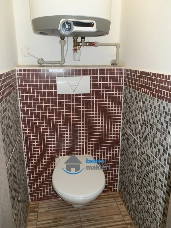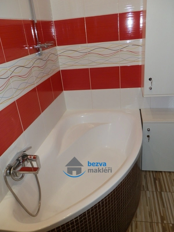 Koupelna je zařízena rohovou vanou, umyvadlem se skříňkou a je zde i prostor pro pračku. WC je oddělené. Ohřev teplé vody zajišťuje bojler.