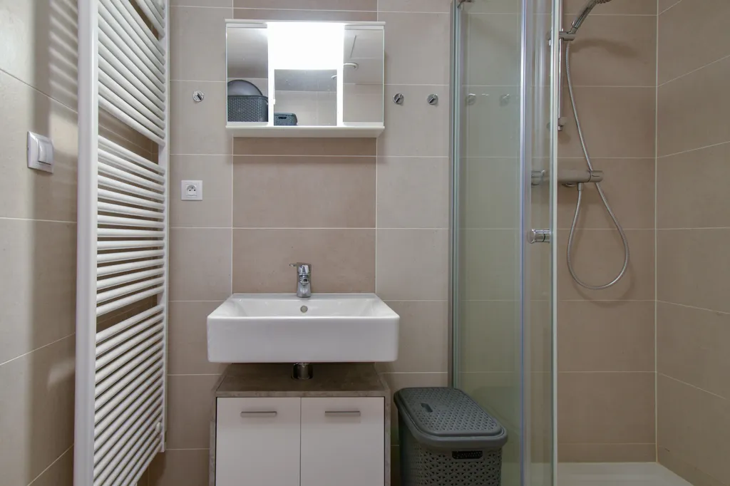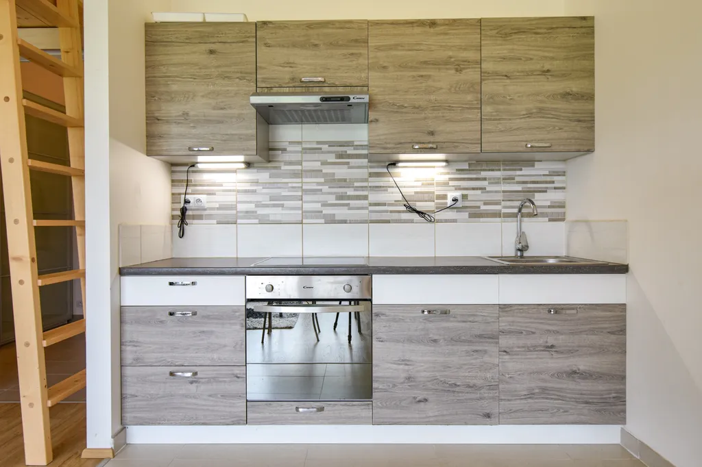 Byt se nabízí vybavený. Součástí moderní kuchyňské linky je lednice, myčka, mikrovlnná trouba, elektrická trouba a sklokeramická deska s digestoří. V kuchyni je dále k dispozici jídelní stůl s židlemi. Obývací část je stylově zařízena rozkládací pohovkou, televizní stěnou s televizí, konferenčním stolkem, psacím stolem s židlí a spacím patrem. Z pokoje se vchází na terasu. V nové koupelně se nachází sprchový kout, umyvadlo se zrcadlem, pračka a toaleta. Předsíň je vybavená botníkem a šatní skříní, která nabízí dostatek úložného prostoru.
