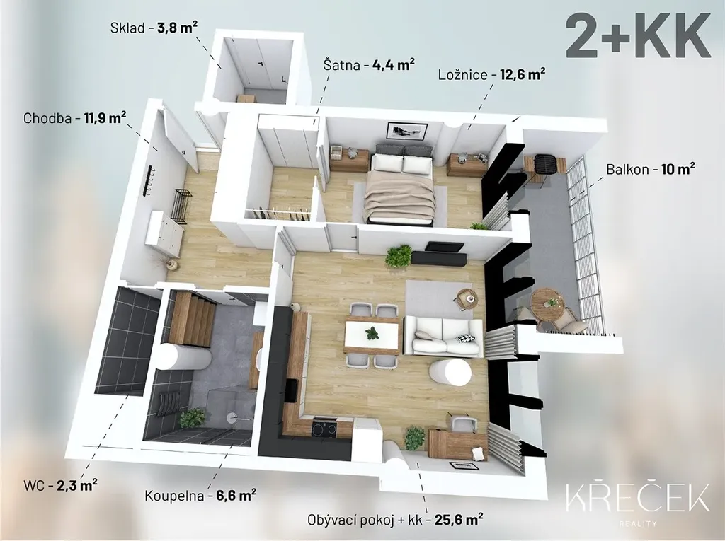 Byt 2+kk o celkové ploše 68 m² ve 3. nadzemním podlaží nabízí komfortní prostor s balkonem 11 m² a praktickým sklepem (4 m²) na patře. Standardem jsou teplovodní podlahové vytápění, velkoformátová okna a vysoké stropy.