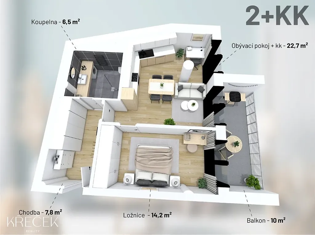 Byt 2+kk o celkové ploše 55 m² ve 3. nadzemním podlaží nabízí komfortní prostor s balkonem 11 m² a praktickým sklepem (4 m²) na patře. Standardem jsou teplovodní podlahové vytápění, velkoformátová okna a vysoké stropy.