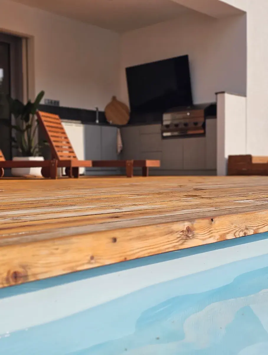 Venkovní bazén se slanou vodou o rozměrech 8x3 m je vytápěn vlastním tepelným čerpadlem.