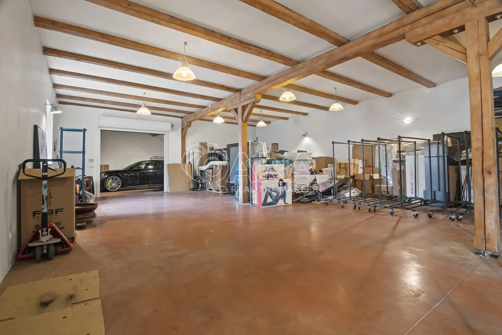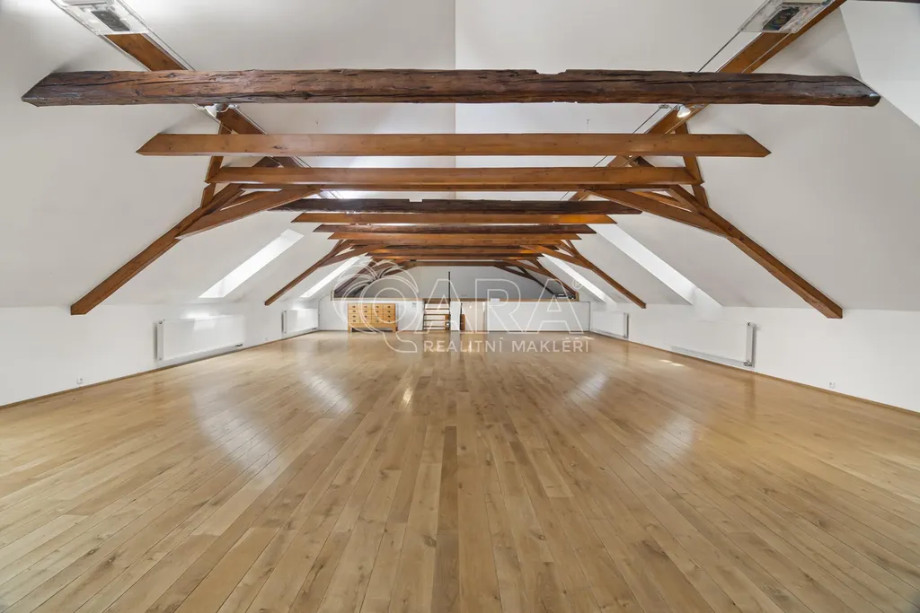 Celková podlahová plocha činí 469,5 m and sup2; ve dvou podlažích. Přízemí o velikosti 221 m and sup2; je řešeno jako skladový prostor s možností přímého vjezdu, zatímco horní podlaží o výměře 248,5 m and sup2; tvoří otevřený a reprezentativní prostor vhodný pro showroom, kanceláře nebo ateliér. Díky konstrukčnímu řešení krovu bez podpěrných sloupů je prostor maximálně variabilní a vzdušný.