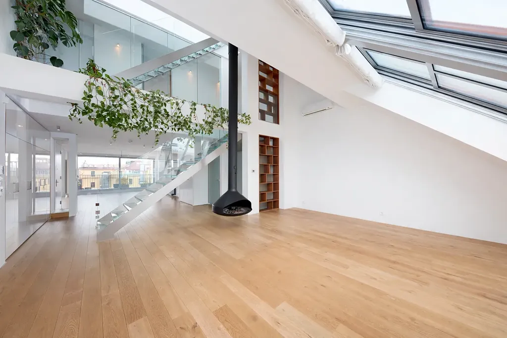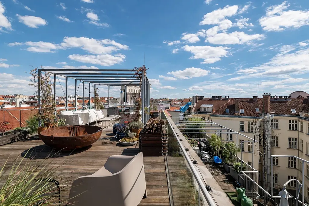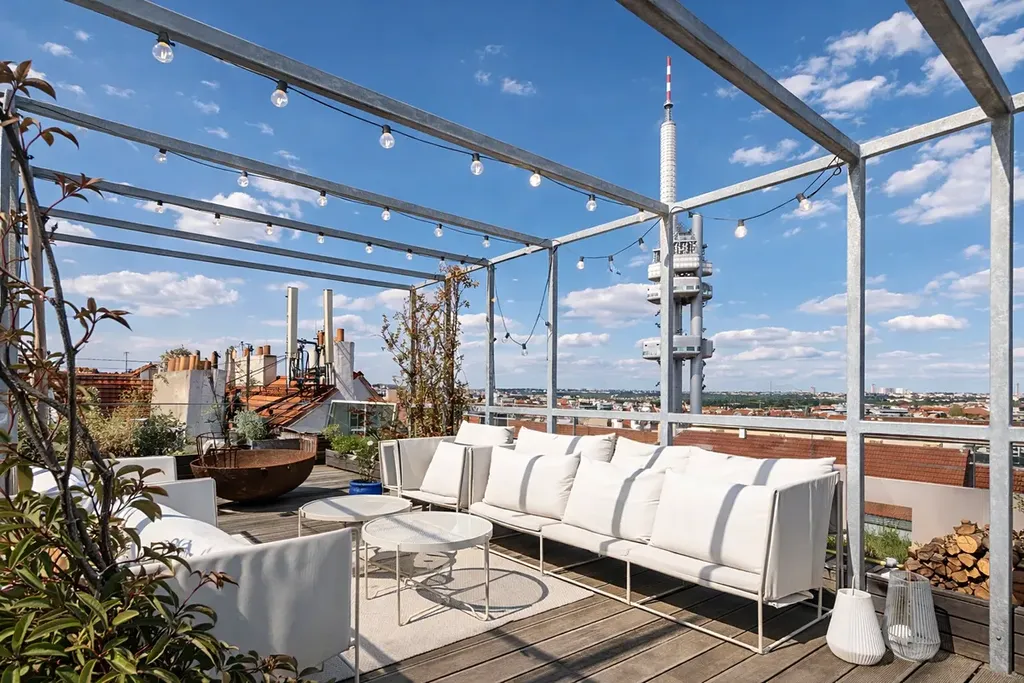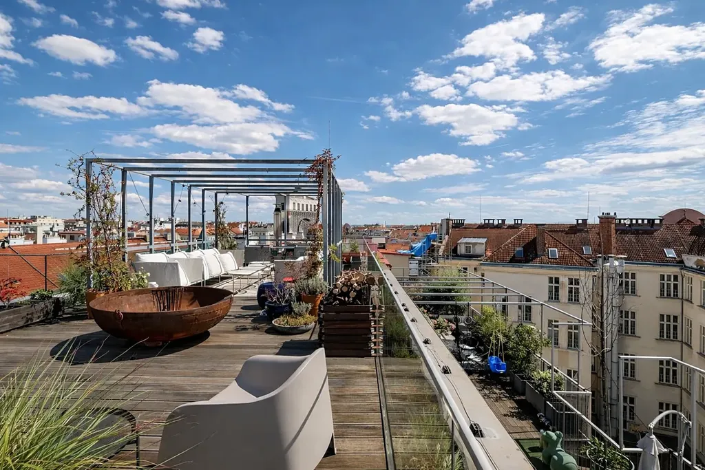V exkluzivní rezidenci Laubova nabízíme k pronájmu výjimečný mezonetový byt o dispozici 4+kk s celkovou plochou 454 m² včetně tří teras. Samotná obytná plocha činí 260,5 m² a navazují na ni terasy o celkové výměře 193,5 m². Absolutní dominantou této jedinečné nemovitosti je rozlehlá střešní terasa s otevřeným výhledem na kostel Nejsvětějšího Srdce Páně na náměstí Jiřího z Poděbrad.