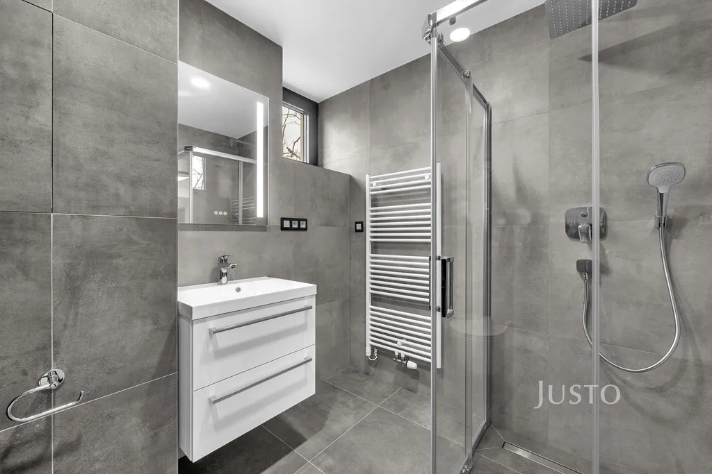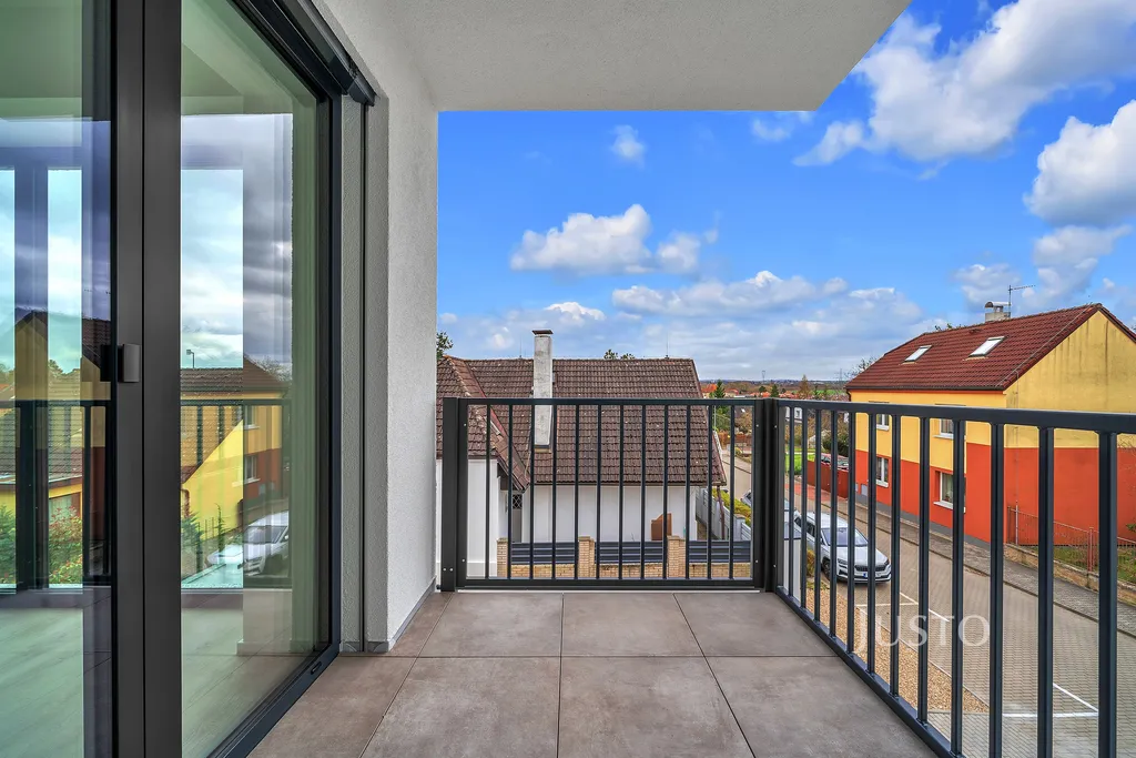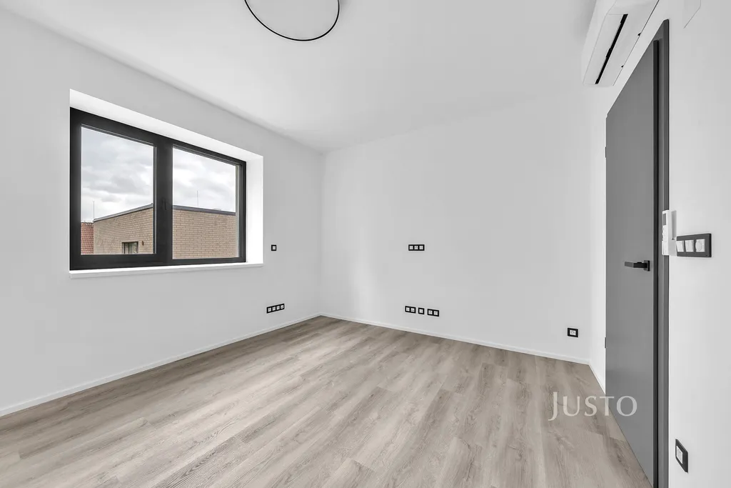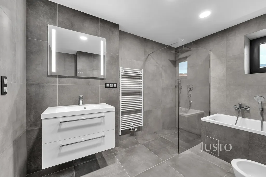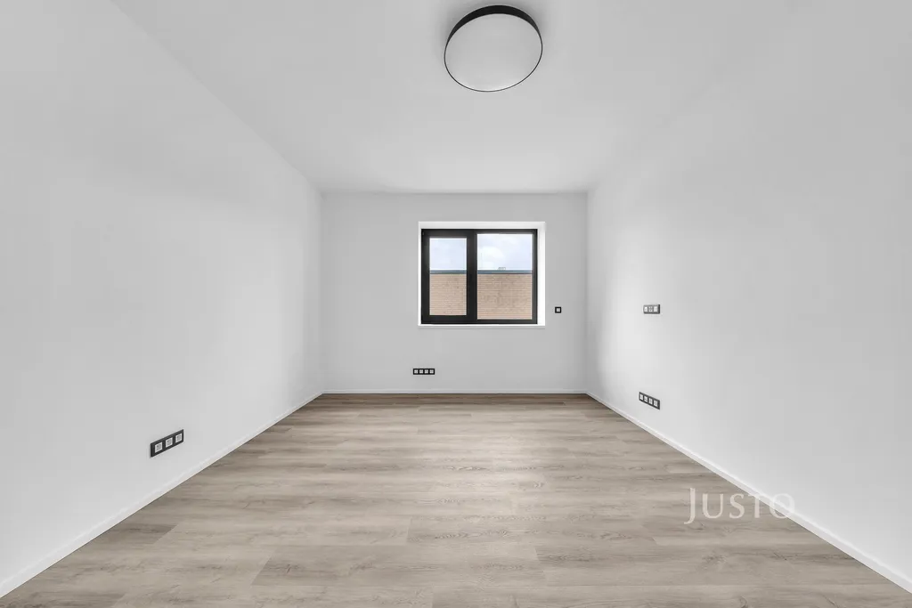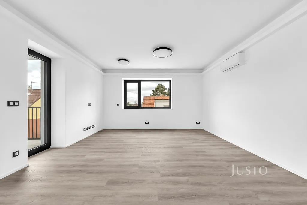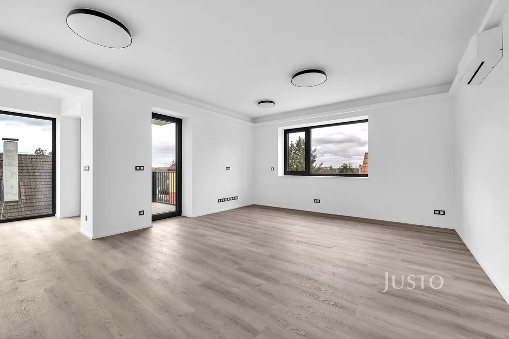 Interiér bytu je světlý díky velkým hliníkovým oknům s venkovními roletami. Podlahové vytápění s tepelným čerpadlem zajišťuje příjemné klima po celý rok, komfort umocňuje i klimatizace. V koupelnách dominuje kvalitní velkoformátová dlažba a moderní sanita. Díky preciznímu zpracování a promyšlenému designu poskytuje byt vysoký standard bydlení.