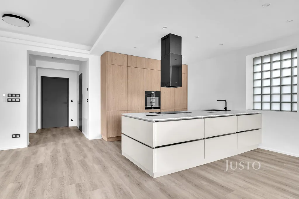 Dispozice bytu nabízí: velkorysý obývací pokoj s kuchyňským koutem o ploše 52,9 m², dva samostatné pokoje (20,8 m² a 18,0 m²), ložnici (13,9 m²), prostornou vstupní halu (22,6 m²), komoru, samostatné WC a dvě koupelny – jedna s vanou i sprchovým koutem (8,0 m²), druhá se sprchou (4,9 m²). Moderní kuchyň je vybavena linkou na míru včetně spotřebičů – lednice, mrazák, myčka a elektrická varná deska. Byt se pronajímá nevybavený.