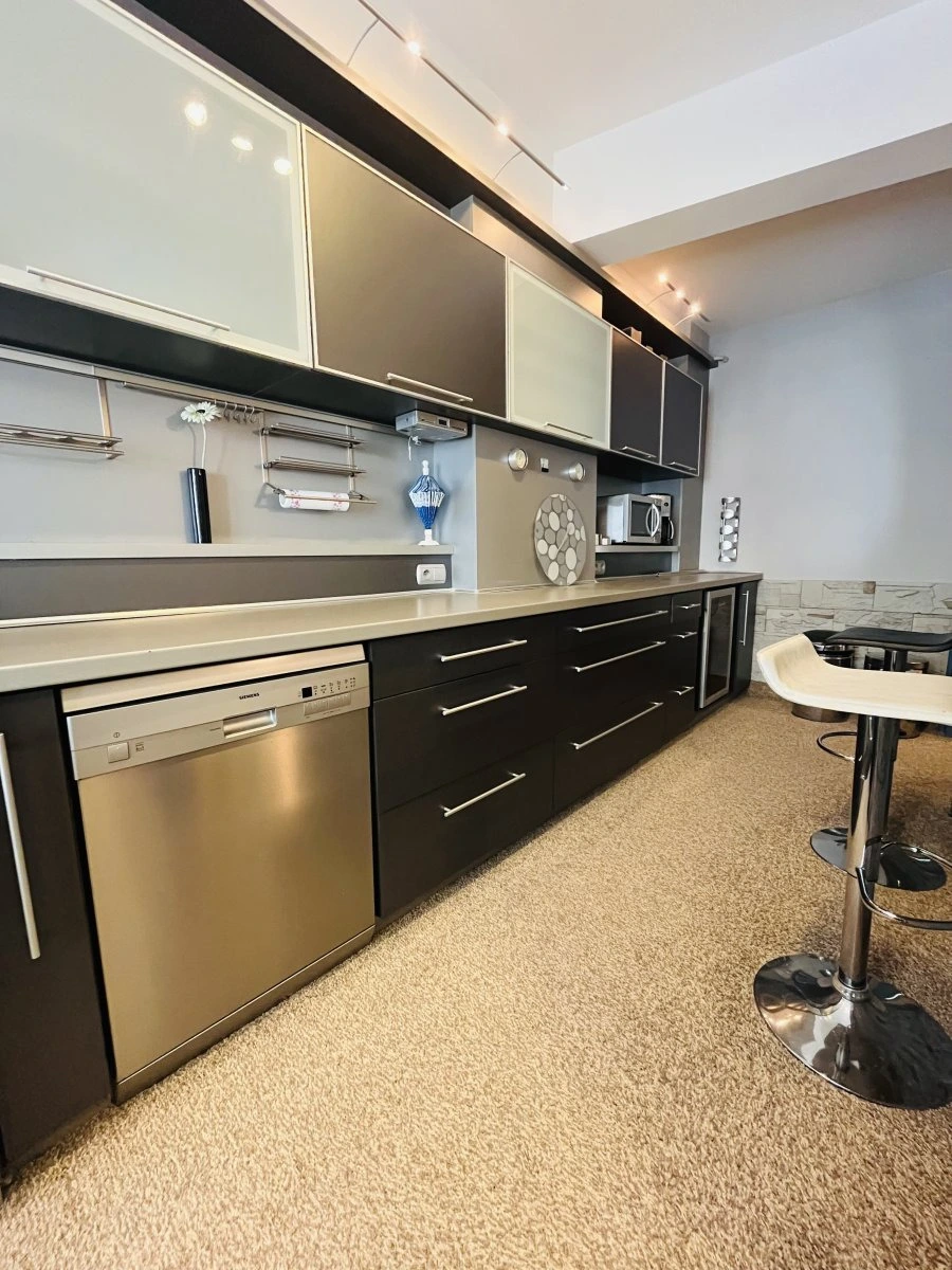 Z chodby míříme přímo do kuchyně, ve které najdeme elektrickou troubu, plynový sporák, myčku, digestoř a lednici. Byt je zrekonstruovaný, v oknech jsou žaluzie. .