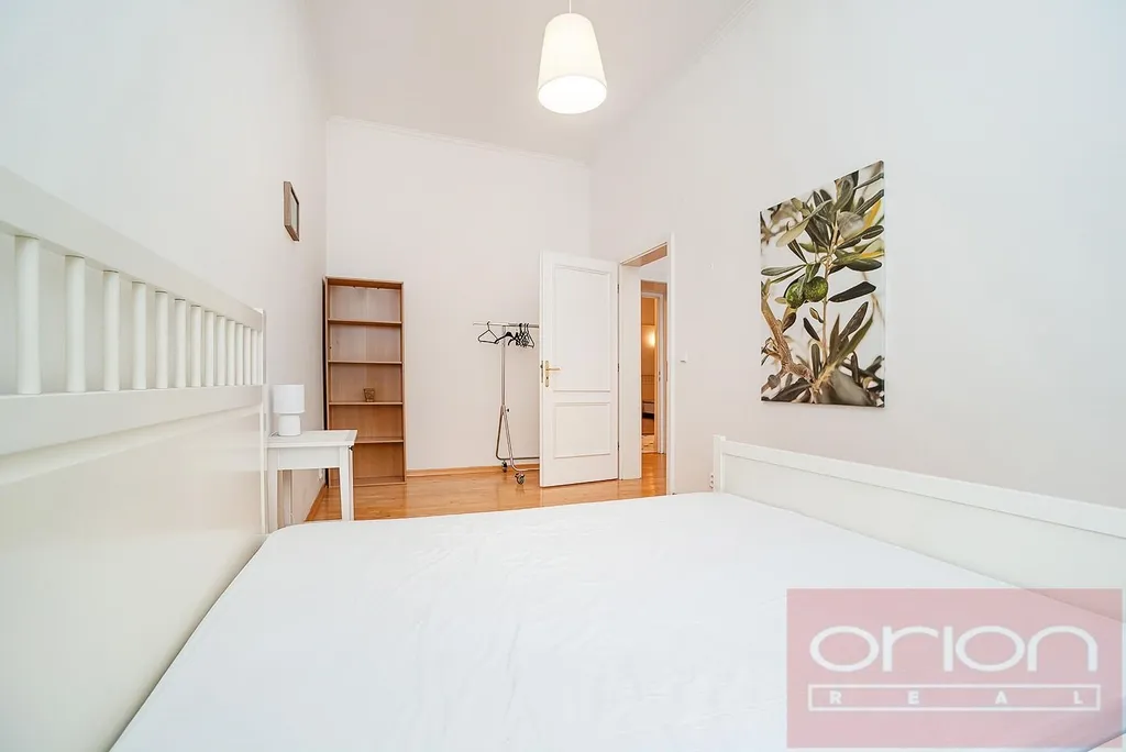 Byt o celkové ploše 122 m² nabízí vstupní halu, světlý a prostorný obývací pokoj propojený s jídelnou a plně vybavenou kuchyní, dvě ložnice (z nichž jedna má přímý vstup na balkon orientovaný do klidného vnitrobloku), koupelnu s vanou, sprchovým koutem, umyvadlem a toaletou, dále samostatnou toaletu a praktickou komoru.Standard bytu zahrnuje vysoké stropy, parketové podlahy v kombinaci s dlažbou a plynové vytápění. K vybavení patří vestavěné skříně v chodbě i ložnici, jídelní stůl se židlemi, postele, TV stolek s televizí a sedací souprava.