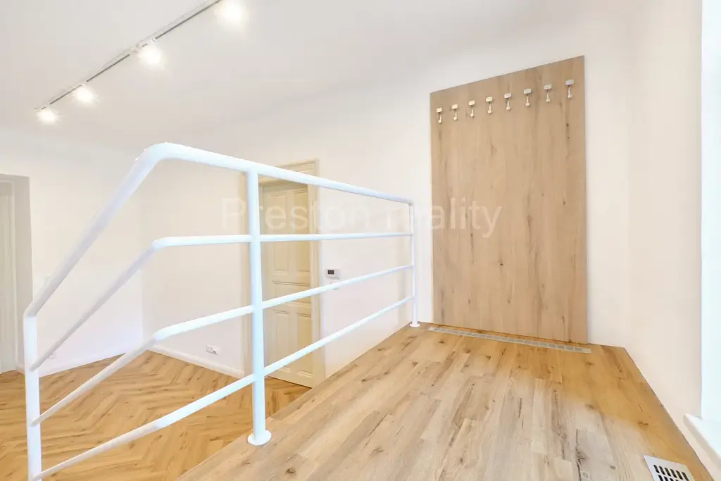 Prostory se skládají ze třech hlavních místností, z nichž 2 jsou neprůchozí: průchozí vstupní místnost (17 m2) je vybavena věšáky a botníky integrovanými do lavice. Další místnost se stejnou orientací do ulice (23 m2) je nevybavena, obě tyto místnosti mají na podlahách položeny nové parkety. Třetí nevybavená místnost s orientací do dvora (17 m2) má na podlaze zátěžovou umělohmotnou pokládku. První dvě místnosti a kuchyň mají podlahové vytápění.