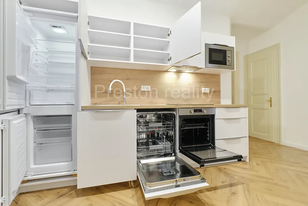 Mezi těmito místnostmi se nachází kuchyň, která má rovněž svůj vlastní vchod z chodby domu, v případě využívání výhradně tohoto vchodu jsou pak všechny 3 místnosti neprůchozí. Kuchyň je vybavena myčkou, lednicí s mrazákem, sklokeramickou varnou deskou, troubou, digestoří s filtrem a mikrovlnnou troubou. Z kuchyně se vstupuje na WC a do koupelny se sprchovým koutem a přípravou pro umístění pračky. Prostor je vytápěn indukčním plynovým kotlem zn. Vailant, který rovněž zajišťuje ohřev vody.