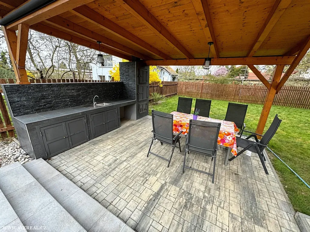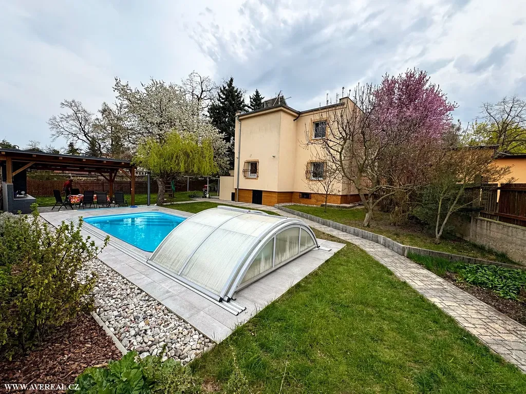 Na pozemku se nachází zastřešený bazén o ploše přibližně 18 m² a hloubce 1,5 m, vybavený pískovou filtrací a je dohřívaný solárními panely ze střechy RD. Součástí zahrady je také prostorná pergola s letní kuchyní, přívodem vody a elektřiny, lednicí a krbem s udírnou. Dále je zde zděný sklad o velikosti cca 16 m² a pečlivě udržovaná zahrada s okrasnými i ovocnými stromy.