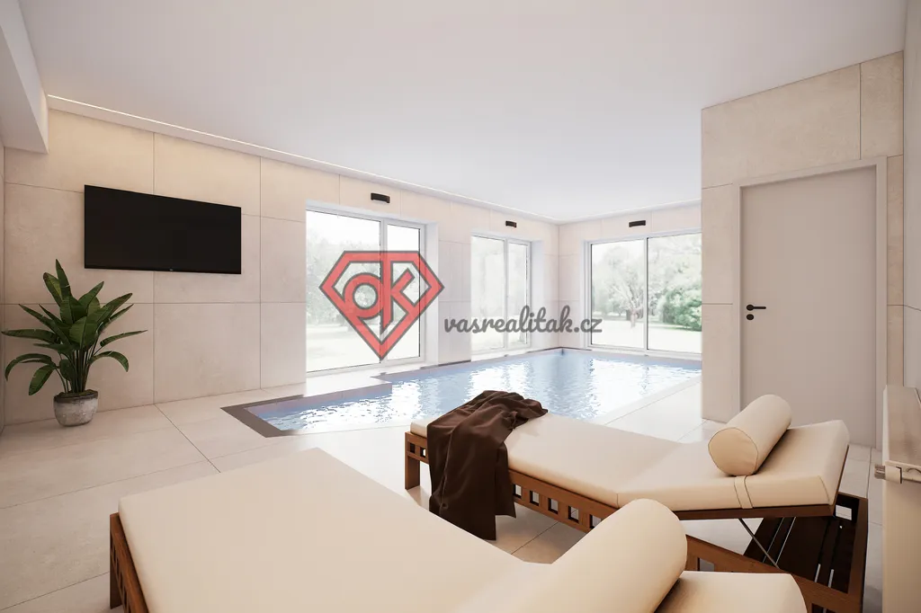 1. NP - garáž, šatna, výtahová šachta (příprava na výtah), příprava pro krytý bazén s barem, šatnou, toaletou a technickou místností